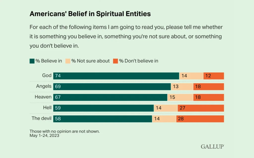 A Gallup survey (May 2023) shows 74% of Americans believe in God, while 69% believe in angels and 67% in heaven. Belief drops for hell (59%) and the devil (58%).